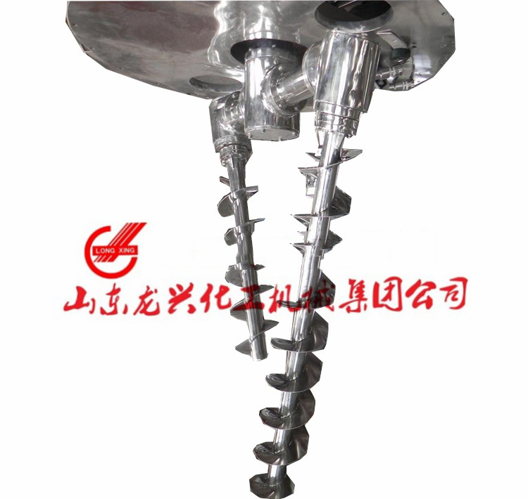 不銹鋼電加熱雙螺旋錐形混合機筒內兩只非對稱螺旋自轉將物料向上提升,轉臂慢速公轉運動;使螺旋外的物料,不同程度進入螺柱,從而達到全圓周方位物料的不斷更新擴散,被提到上部的兩股物料再向中心凹穴匯合,形成一股向下的物料流,補充了底部的空缺,從而形成對流循環(huán)的三重混合效果;標準型錐形螺旋混合機有兩根攪拌螺旋,實際應用中根據(jù)設備規(guī)格大小可以采用單(一根長螺旋)、雙(長短各一兩根不對稱螺旋)、三(兩短一長對稱布置)根螺旋;理論上攪拌螺旋越多,混合效果越好;不銹鋼雙螺旋錐形混合機根據(jù)工藝要求可在混合機筒體外增加夾套,通過向夾套內注入冷熱介質來實現(xiàn)對物料的冷卻或加熱;冷卻一般泵入工業(yè)用水,加熱可通入蒸汽或電加熱導熱油;設備一般采用梅花狀“錯位閥”,此閥與長螺旋底部貼合緊密,有效減少混合死角,驅動形式有手動和氣動可選;夾套可以采用導熱油電加熱或者半圓管式加熱或冷卻等方式。根據(jù)用戶需要,也可加裝蝶閥、球閥、星形卸料器、邊出料等。