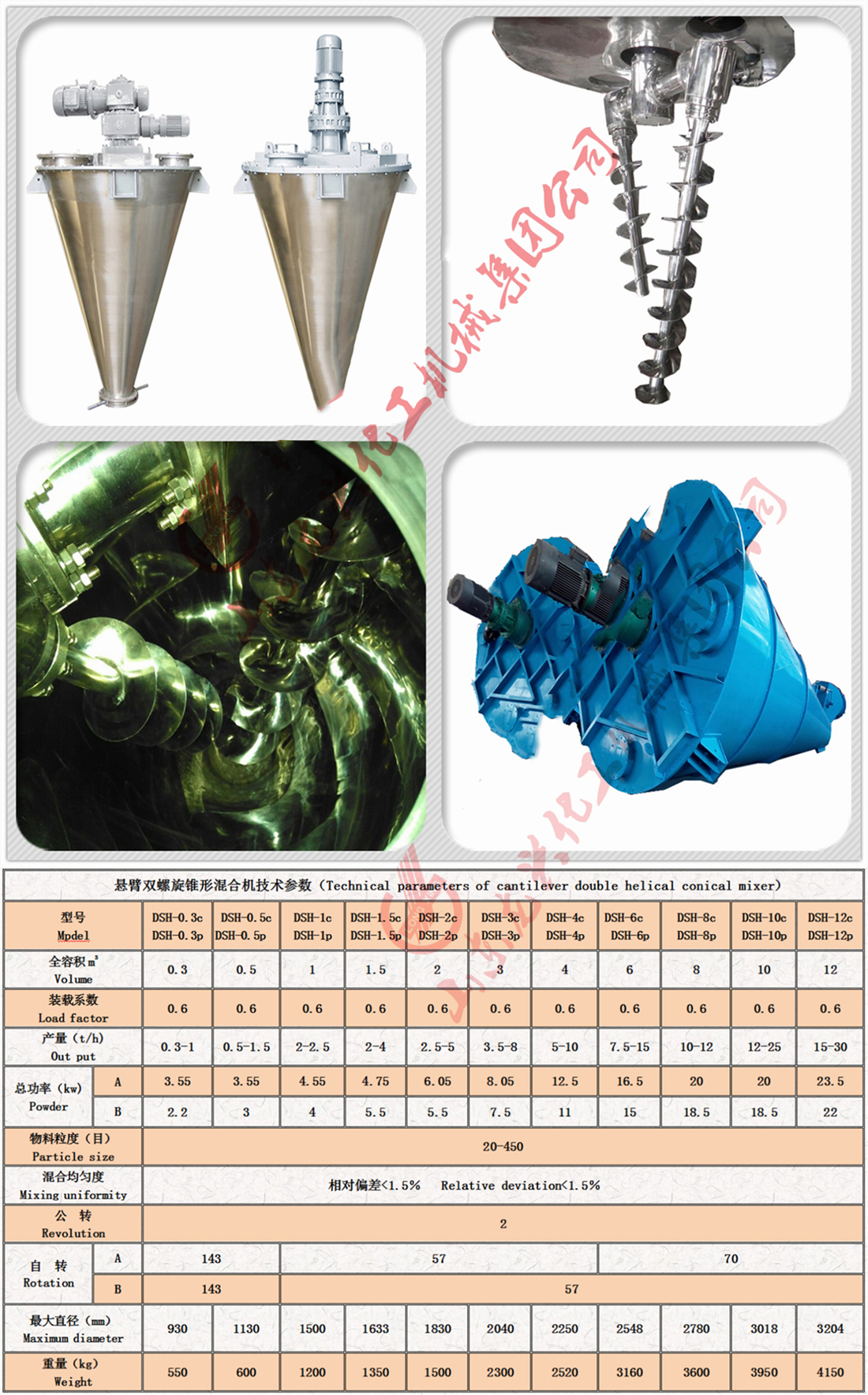 懸臂雙螺旋錐形混合機筒內兩只非對稱螺旋自轉將物料向上提升,轉臂慢速公轉運動;使螺旋外的物料,不同程度進入螺柱,從而達到全圓周方位物料的不斷更新擴散,被提到上部的兩股物料再向中心凹穴匯合,形成一股向下的物料流,補充了底部的空缺,從而形成對流循環的三重混合效果;標準型錐形螺旋混合機有兩根攪拌螺旋,實際應用中根據設備規格大小可以采用單(一根長螺旋)、雙(長短各一兩根不對稱螺旋)、三(兩短一長對稱布置)根螺旋;理論上攪拌螺旋越多,混合效果越好;