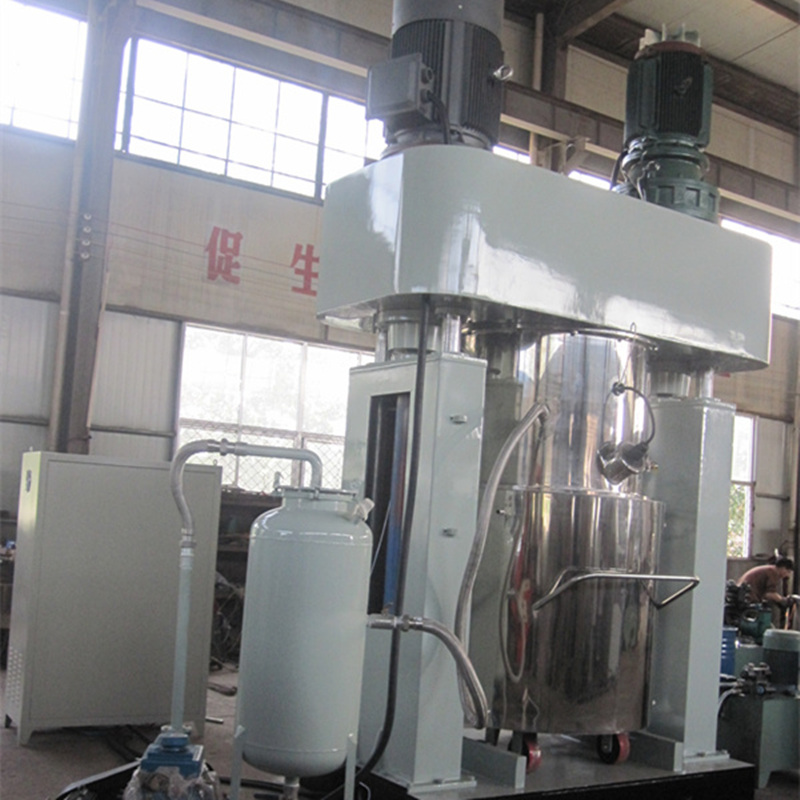 強力分散機有三個電動機,釜內有三根不同形式的攪拌器,其中一個攪拌器在繞釜體軸線轉動,其余兩個攪拌裝置又以不同的轉速,繞自身軸線高速自轉,使物料在釜內作復雜的運動,受到強烈的剪切和搓合。機器設備內山形刮刀繞釜體軸線轉動,將粘在壁上和底部的原料刮出,使其效果更為理想。設備密封性好,可抽真空,具有良好的排氣除泡效果。設備缸蓋可液壓升降,缸體可自由移動,操作十分方便。攪拌器的形式,根據物料要求可為多層槳葉式、框式、蝴蝶式、葉輪式等。通常采用變頻調速,以滿足各種工藝要求。