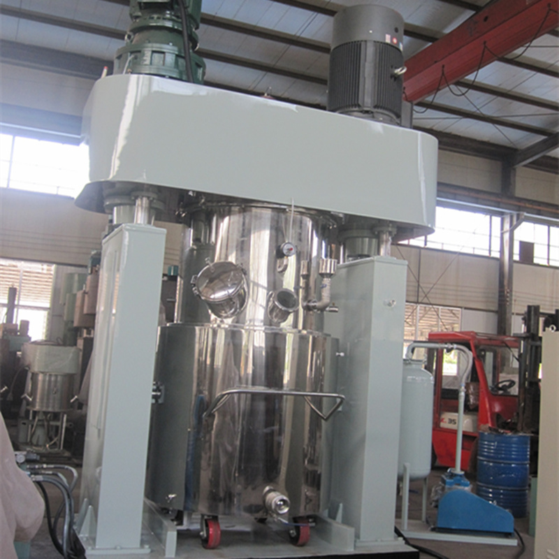 行星架轉動時,帶動箱內的三根攪拌軸圍繞料桶公轉的同時,攪拌軸高速自轉,從而使物料受到強烈的剪切、捏合作用,達到充分分散和混合的目的,在行星架上有一刮壁刀隨行星架轉動,不斷的掛拭桶壁,使桶壁無滯留料,提高混合效果。本裝置能在真空下工作,能不斷排出水分及其他揮發物,因此,可作為脫氣釜使用。根據需要,料桶可以制造為油、水循環加熱或冷卻,設備的機架、封蓋及攪拌器由雙柱液壓升降、操作平穩、快捷、輕便。本設備還可以實現一個單元的工藝時間自動控制。