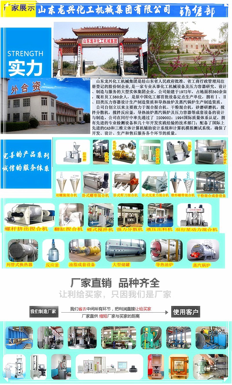山東龍興化工機械集團憑借在業(yè)內(nèi)三十多年的技術(shù)積累和成長經(jīng)歷,已經(jīng)發(fā)展為集科研、開發(fā)、制造為一體的科技型集團公司,主要業(yè)務(wù)涉及液體研磨機、攪拌分散機,膏體混拌捏合機、雙行星動力攪拌混合機,干粉攪拌混合機,導(dǎo)熱油、蒸汽鍋爐、低溫容器及反應(yīng)釜罐和換熱器及一二三類壓力容器的設(shè)計與生產(chǎn)。同時我們承接行業(yè)用戶成套設(shè)備及生產(chǎn)線的設(shè)計制造業(yè)務(wù),龍興人愿與天下有識之士攜手共創(chuàng)新的輝煌。